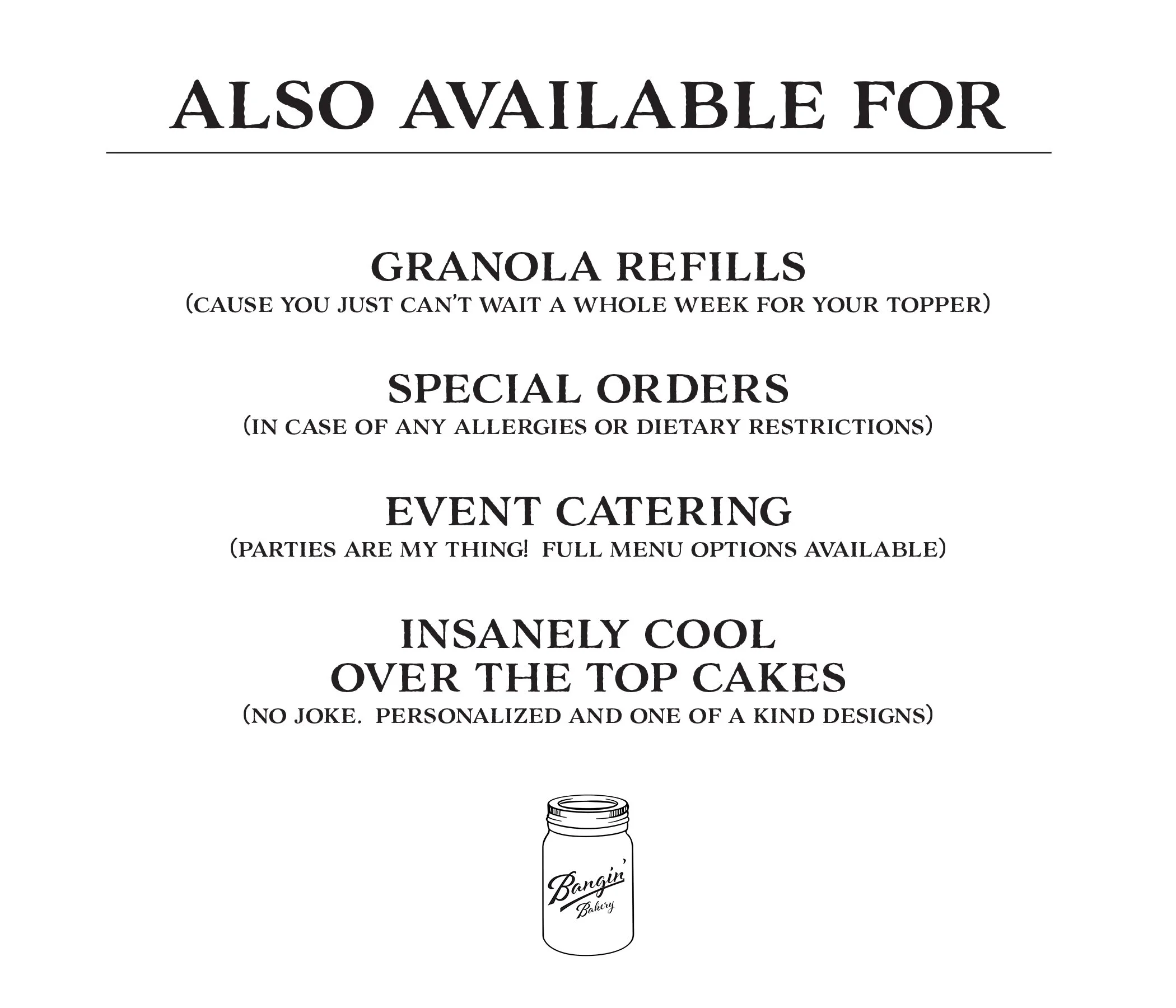 Also…. This Saturday at The Nature Center in New Canaan!  Come by at least say Hi!!! Or get your granola on (refills available too!) and pre-order your holiday gift boxes!!!! Four different sizes and all cram-packed with Bangin’ Baked Go
